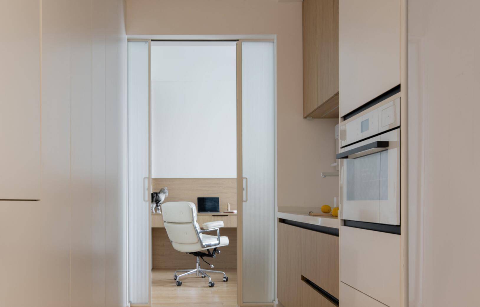 厨房在原有空间结构基础上,将门洞内退,并安装折叠玻璃门。这样不仅能让空间自由开合,还瞬间提升了玄关区的通透性,让空间更显宽敞。
