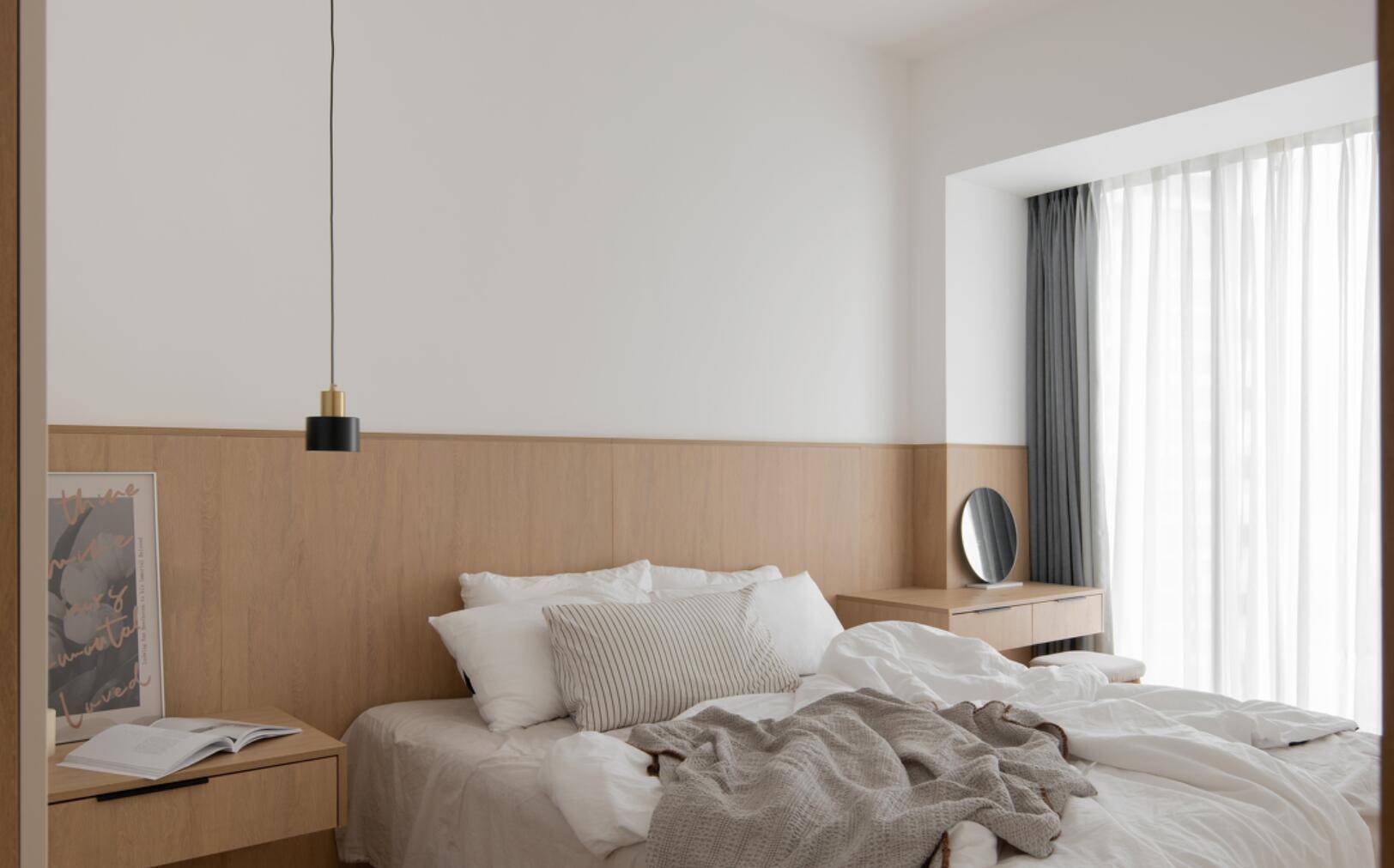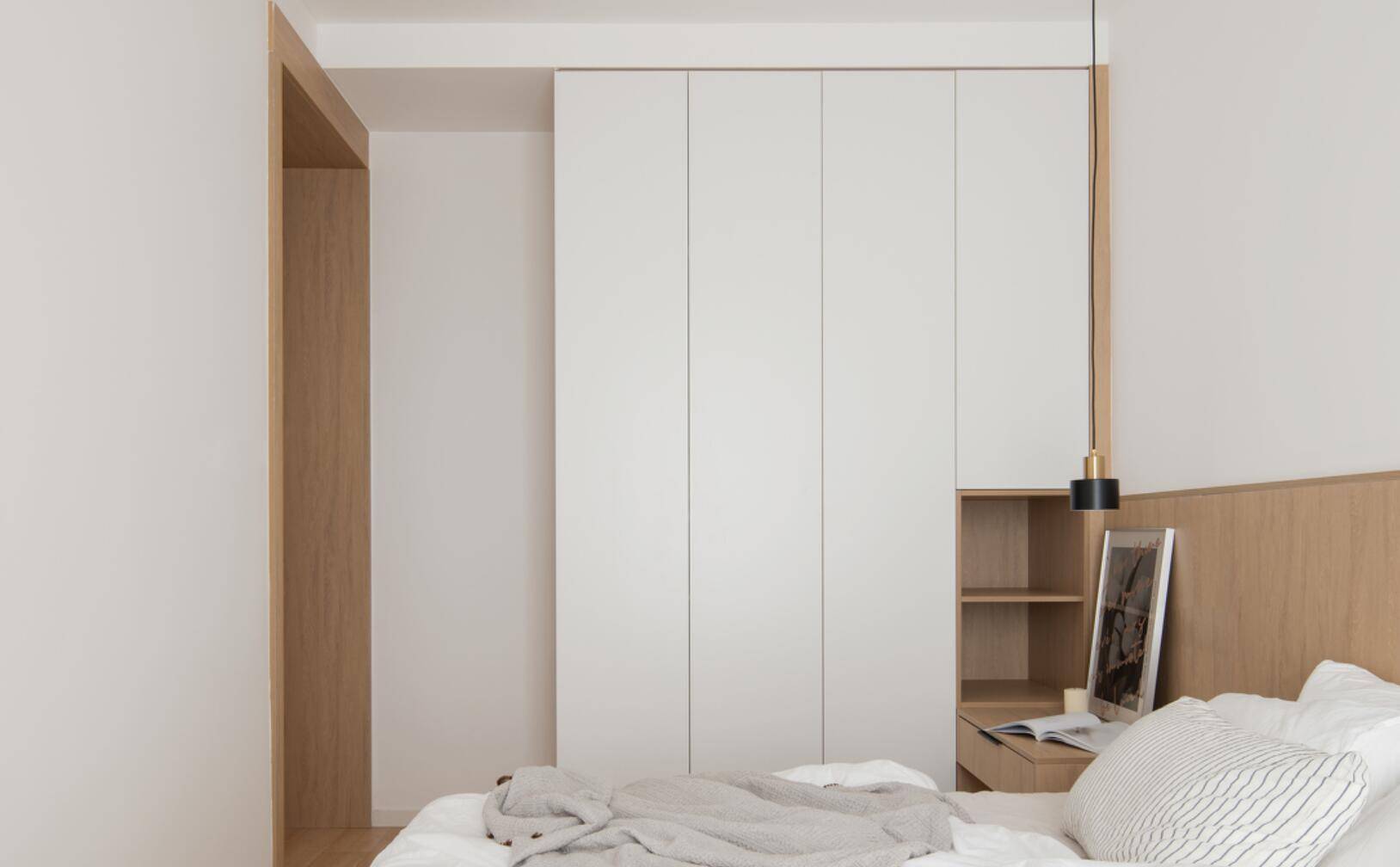 走进主卧,墙面依旧以大面积留白为主,搭配一体化原木床头,看起来清爽宜人,功能性也很丰富。比如左侧床头柜与衣柜连成一体,避免了柜门不好打开的困扰;右侧床头柜兼具梳妆台功能。