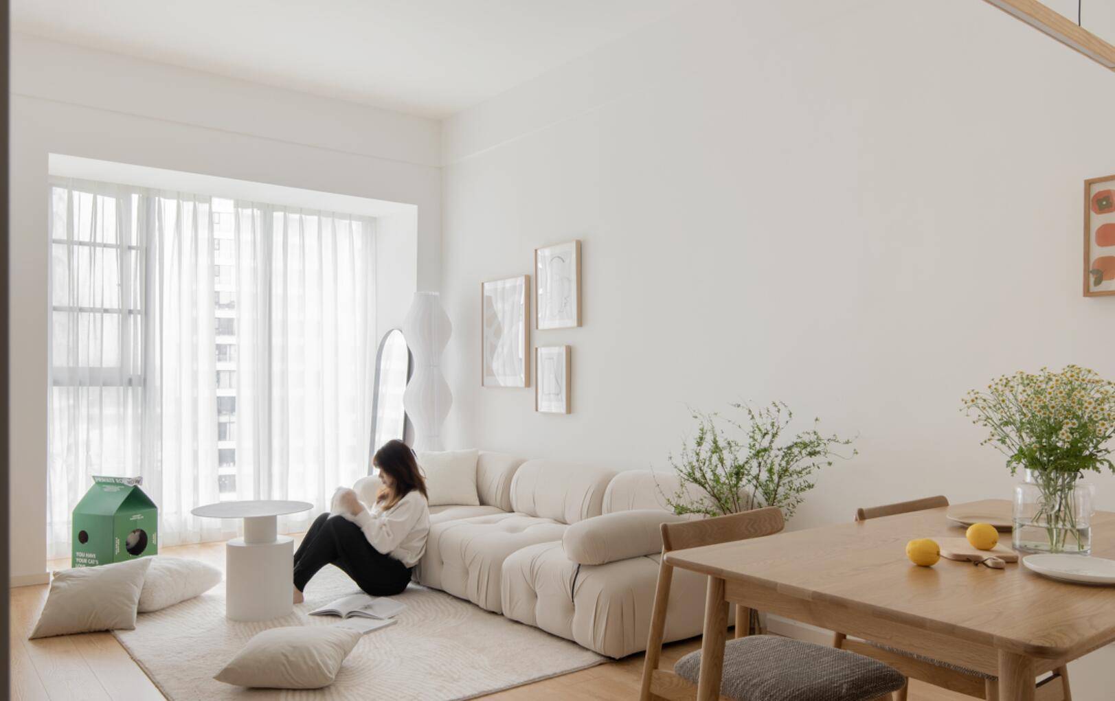 垂感极佳的白色纱帘、灰白色地毯以及造型独特的小茶几,让整个空间散发着轻柔质感。同时,也衬托出空间的开阔,使居住氛围更加轻松惬意。