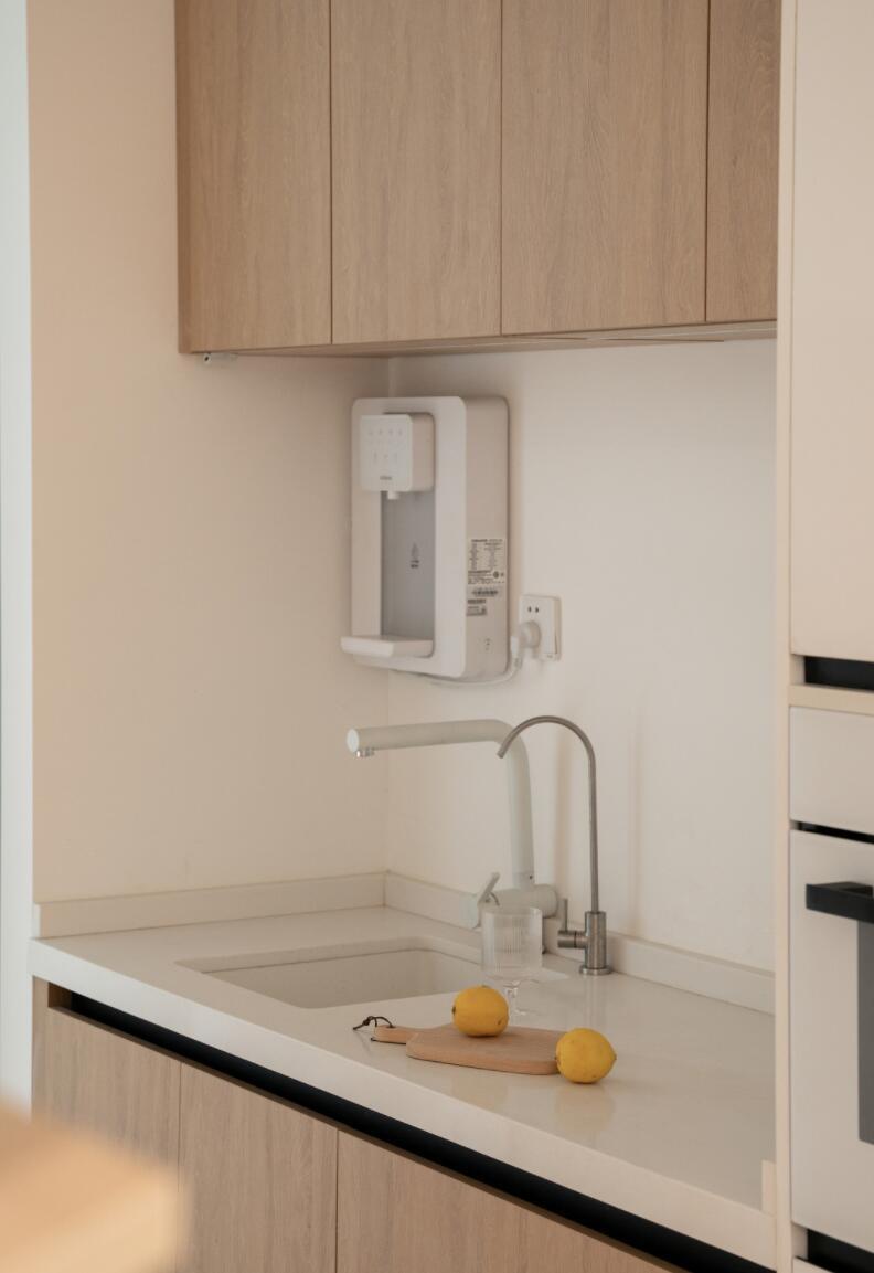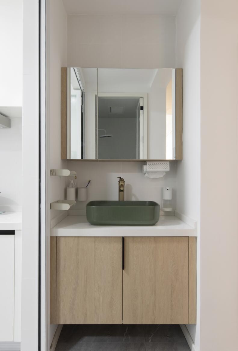 厨房和卫生间空间重新组合后,台盆独立设置在外侧,并与厨房橱柜对齐,工整有序。这样不仅实现了卫生间的干湿分离,还提高了生活的便捷性。特别是在后疫情时代,玄关旁设置洗水池,从入户开始就解决了卫生问题。