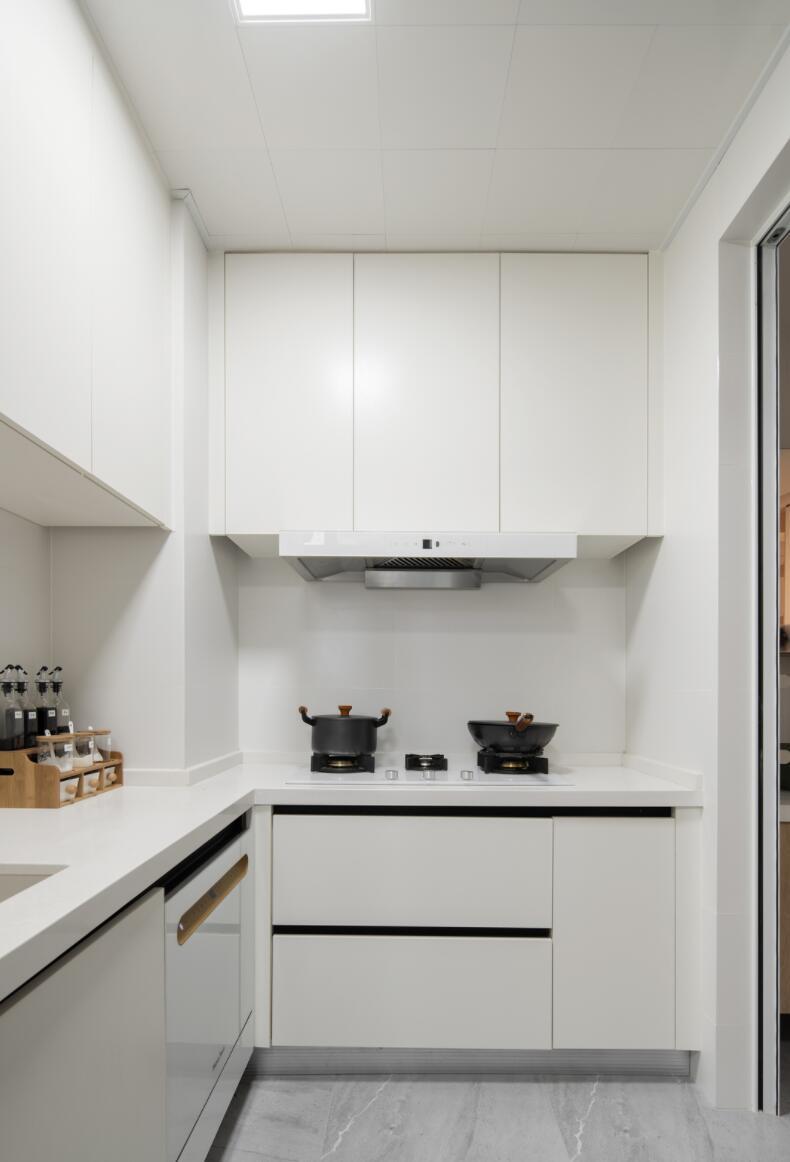 虽然L型橱柜布局面积有所减小,但外面的生活阳台设置了一些柜体作为补充,完全能满足日常使用需求。
