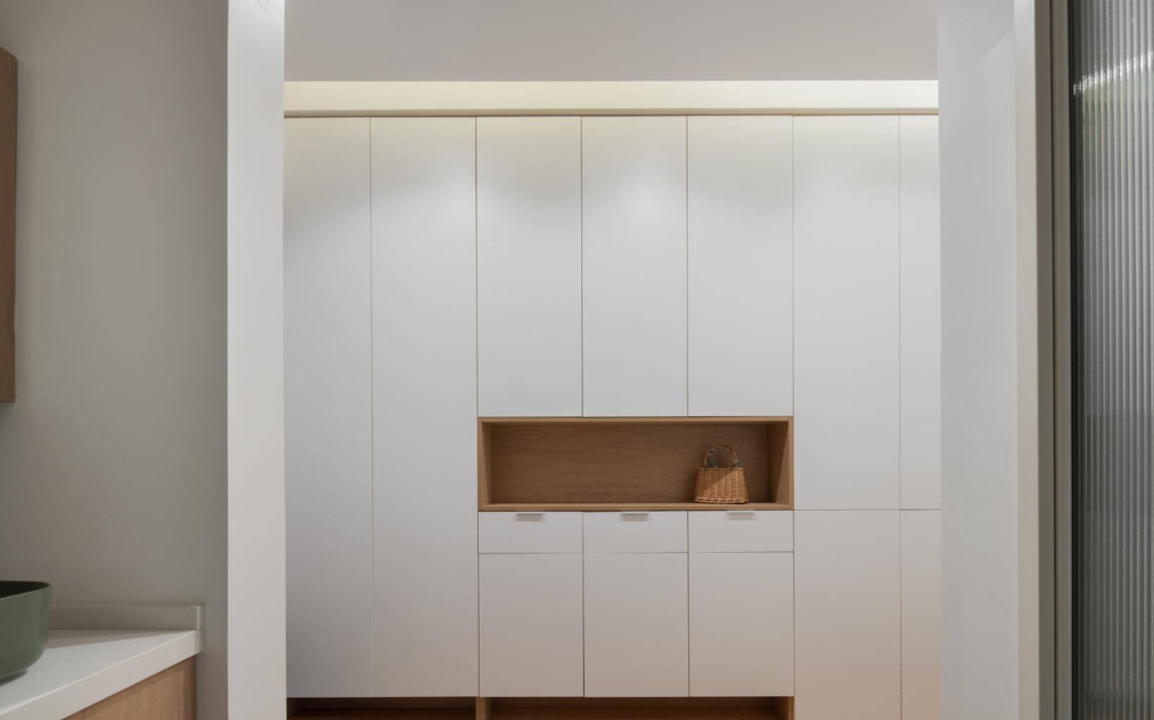 入户左侧打造了一整面墙的储物柜,能最大程度提升玄关的收纳能力。柜体底部悬空,便于收纳日常穿的鞋子;中间位置镂空,方便放置包包、小物品。此外,柜门采用拉手设计,在入户空间局促的情况下,弱化了空间的复杂感。